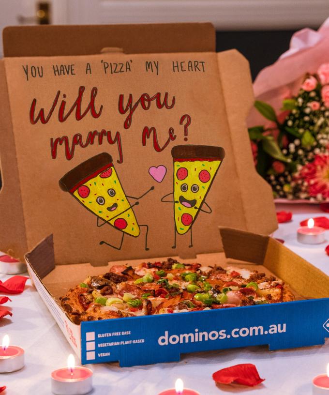Are you and your partner huge fans of Domino’s? Imagine them thinking you were just ordering the usual for a chill Valentine’s Day date at home, and then they open the box to be surprised with an adorable proposal and some delicious pizza!