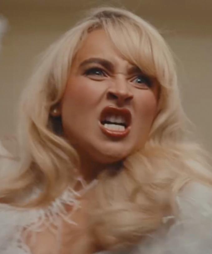 The video then cuts to Sabrina singing the lyrics ‘Oh I leave quite an impression’, while applying lipstick in the reflection of a knife, before cutting to a screen that says ‘Taste’.