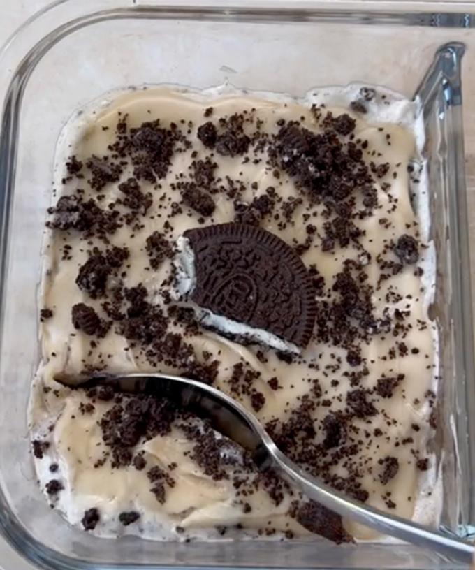 The cream part is made with vanilla yoghurt, vanilla protein powder and then a couple of Oreos to crumble into the mix.