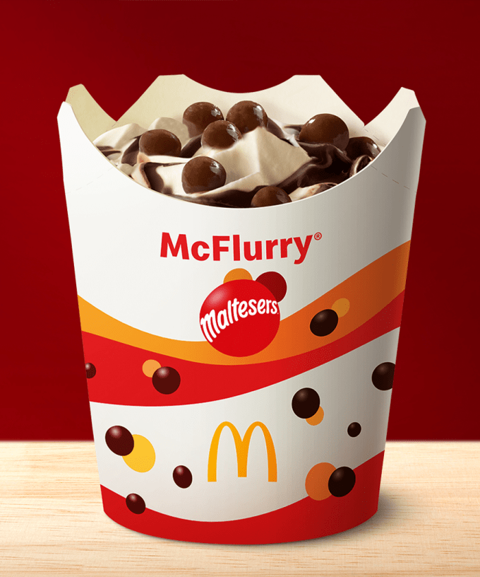 Maltesers McFlurry offers Macca’s iconic soft serve, topped with milk chocolate Maltesers and deliciously sweet chocolate sauce.