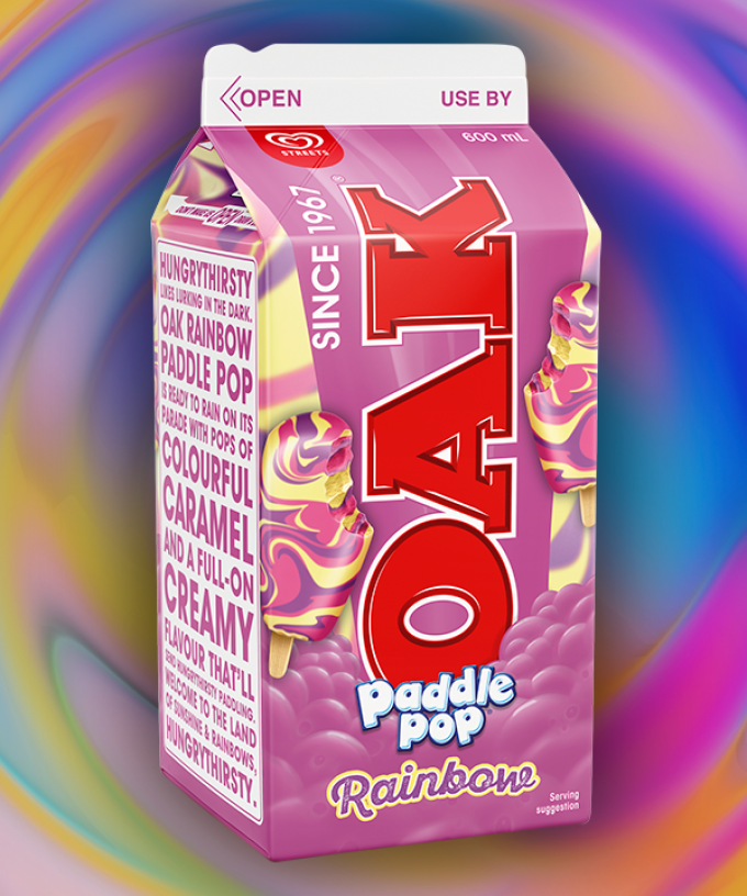 The new OAK Rainbow Paddle Pop 600mL is available for a limited time in Woolworths, Coles, independent grocery and convenience stores.