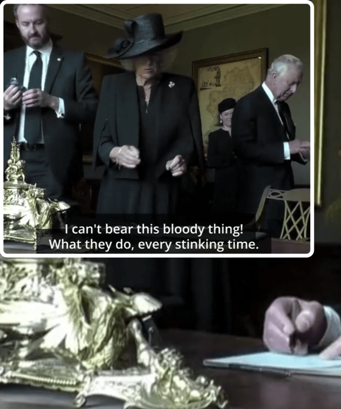 “Oh god I hate this [pen],” he said, as the pen seemingly leaked onto his hand. He then passes it over to his wife, Queen Consort Camilla.